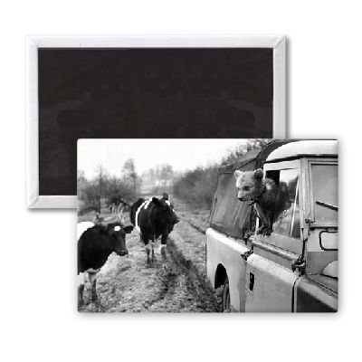 Art247 - A bear cub takes a spin in a Land Rover - Aimant de réfrigérateur, 7,5 x 5 cm - gros bouton aimanté - aimant
