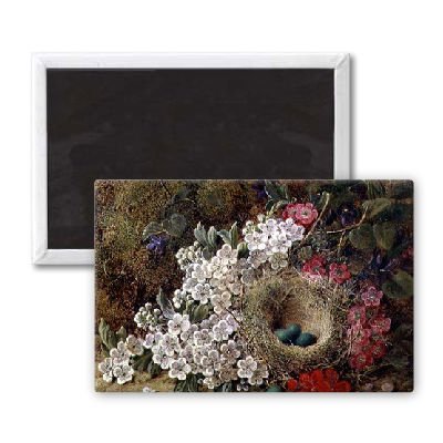 Art247 - A bird's nest and blossom on a mossy bank.. - Aimant de réfrigérateur, 7,5 x 5 cm - gros bouton aimanté - aimant .